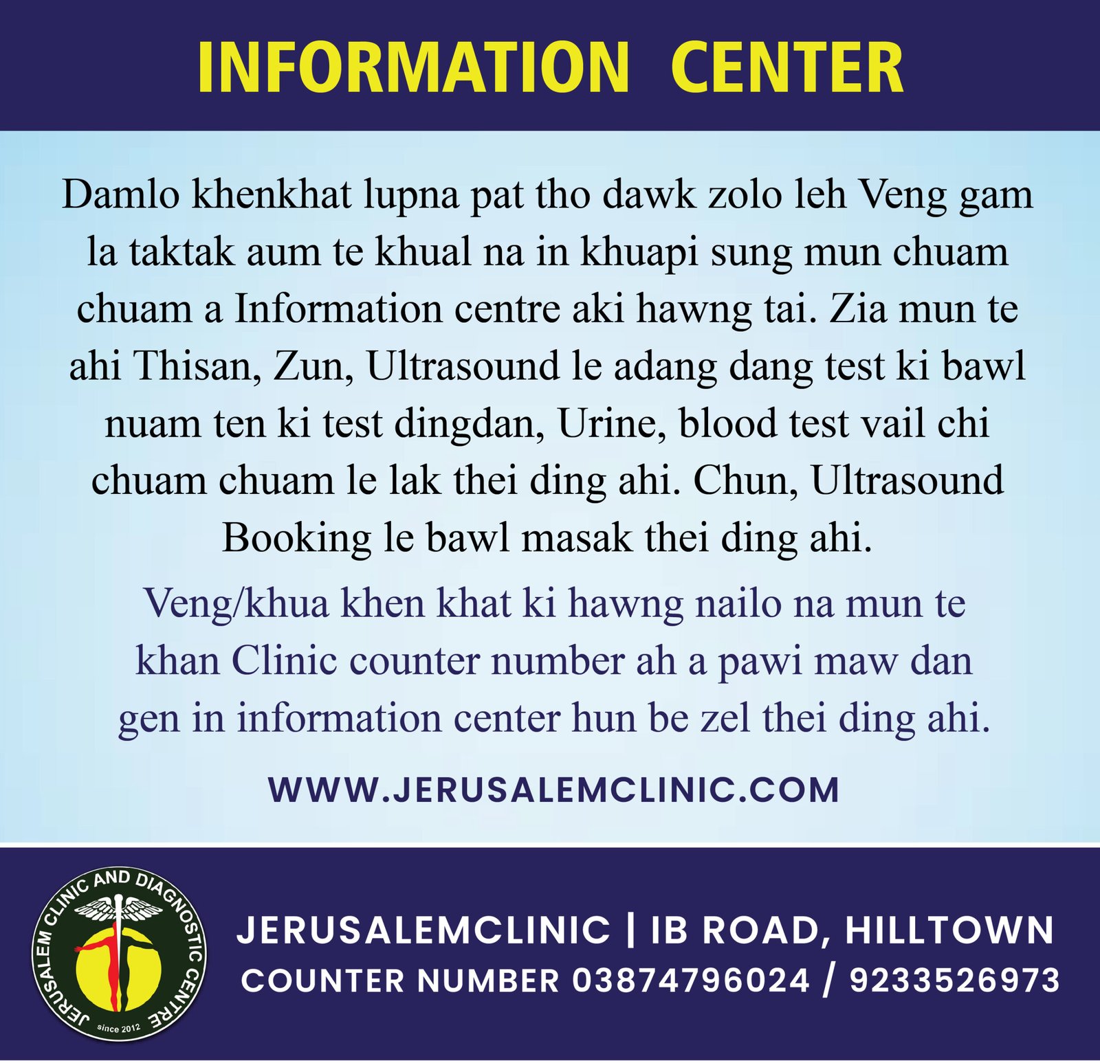 Damlo khenkhat lupna pat tho dawk zolo leh Veng gam la taktak aum te khual na in khuapi sung mun chuam chuam a Information center aki hawng tai. Zia mun te ahi Thisan, Zun, Ultrasound le adang dang test ki bawl nuam ten ki test dingdan, Urine, blood test vail chi chuam chuam le lak thei ding ahi. Chun, Ultrasound Booking le bawl masak thei ding ahi.