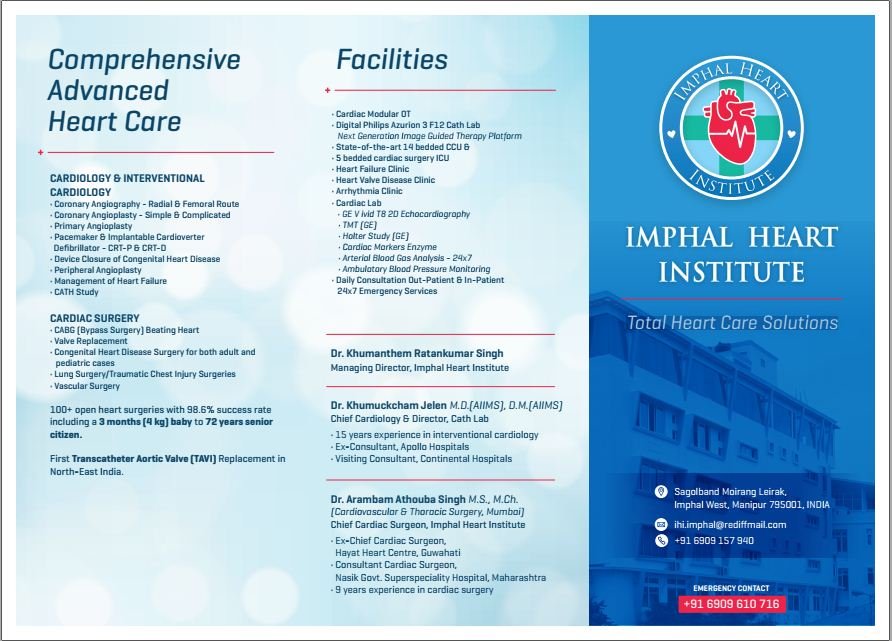 Imphal Heart Institute a pat in damlou hung en ding ahi. Lungchang lam ah nawplou na nei te ki etsak vek thei ding ahi. A ki etsak nuam te’n ki etsak man pia in min zik lut thei ding ahi. Zia ni hin echocardiogram(echo) le bawl thei ngal hi ding ahi. Echo bawl man Rs.1800/- hi ding a hi.